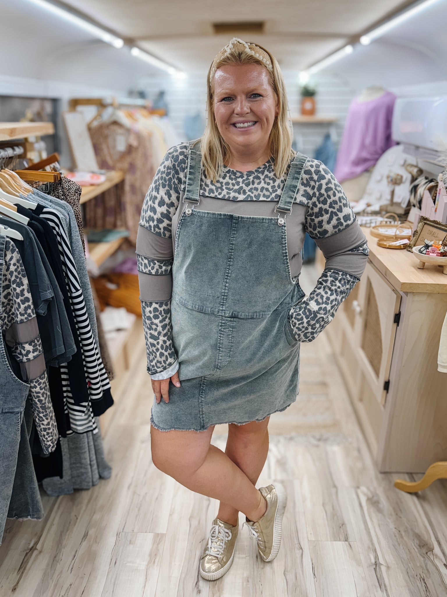 One of my favorite items to buy is a jumper dress! Charcoal grey, corduroy material with pockets, adjustable straps and raw hem detail. This one pairs great with cute sneakers as well as booties and a turtle neck for later in the fall!