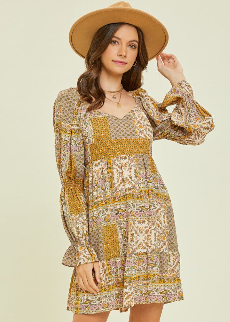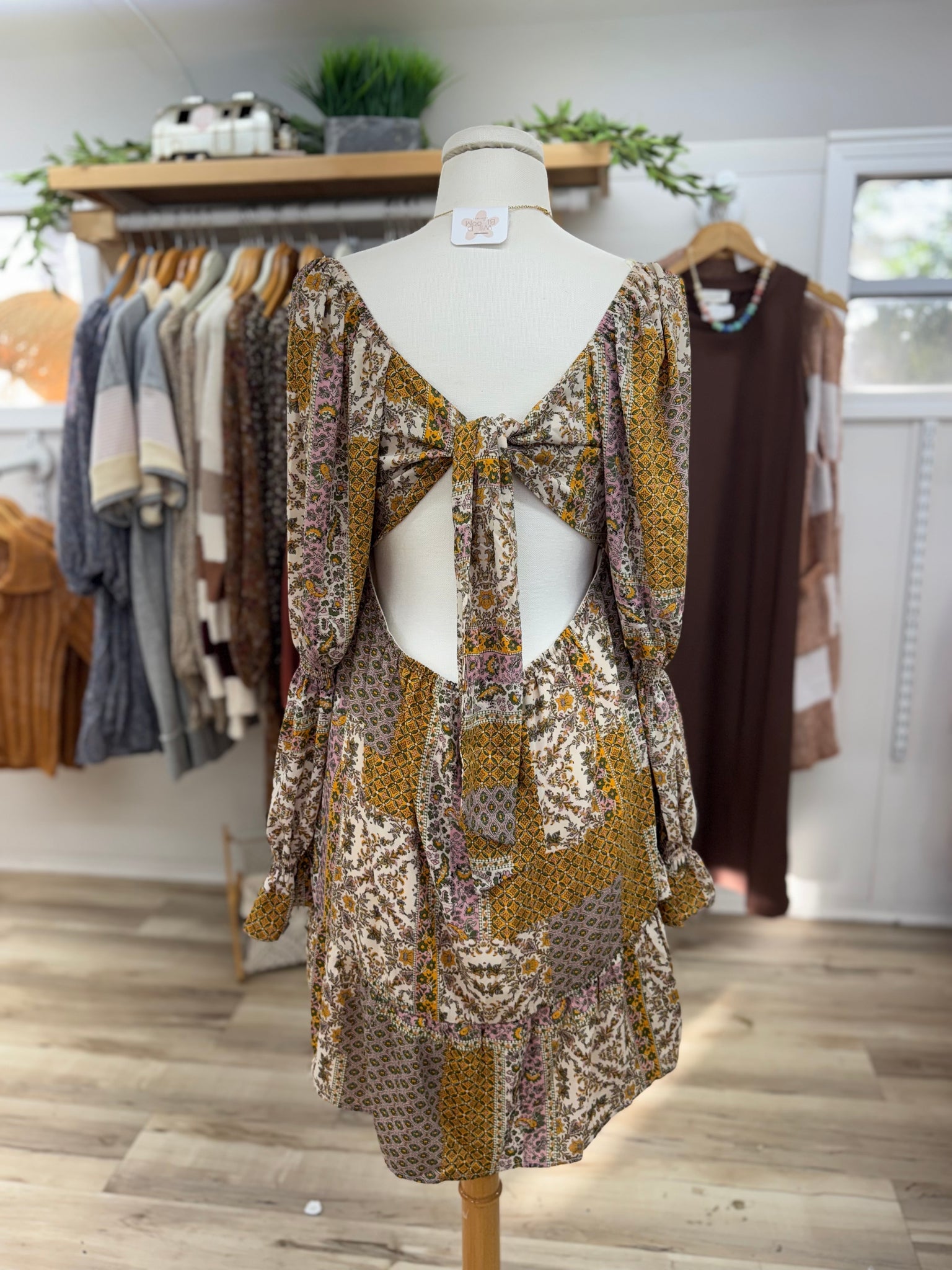 Gosh, this dress is just everything we love! Western multi pattern dress with cinched wrists and tie back.  Pair this with cowboy boots, a hat, and a long cardigan and you have a chic, winter outfit!